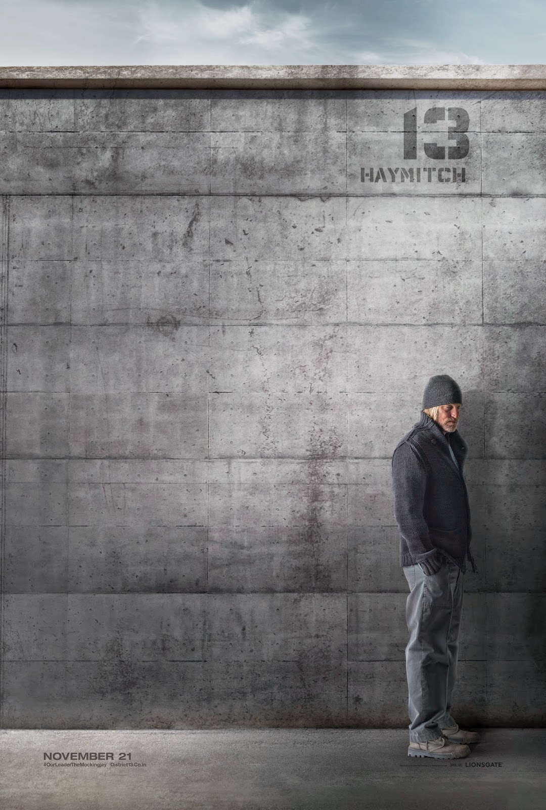 Os pôsteres mostram a Presidenta Coin, Plutarch Heavensbee, Beetee em cadeira de rodas, Haymitch Abernathy, Finnick Odair e Effie Trinket sem suas cores exuberantes. A protagonista Katniss Everdeen e seu amigo Gale Hawthorne não tiveram pôsteres exibidos.